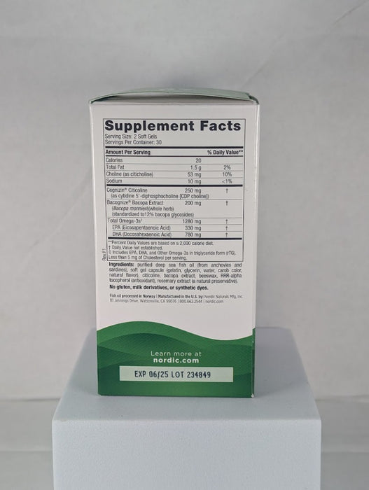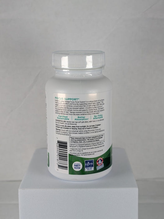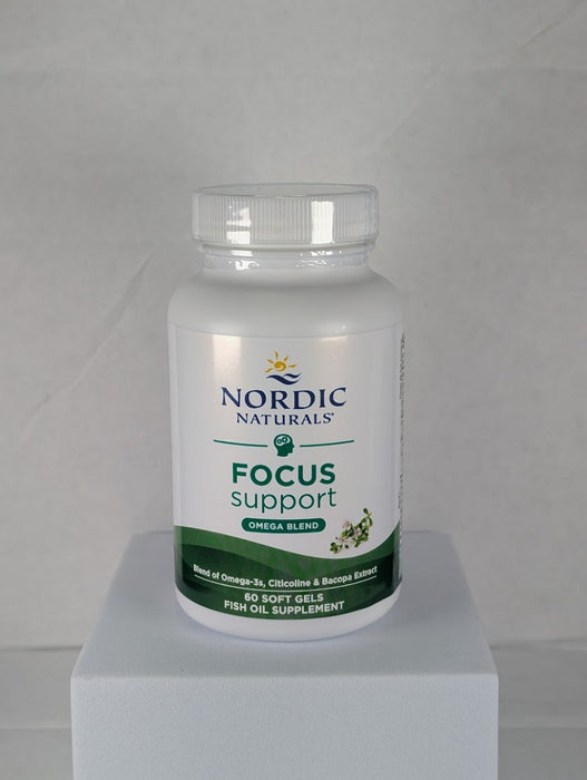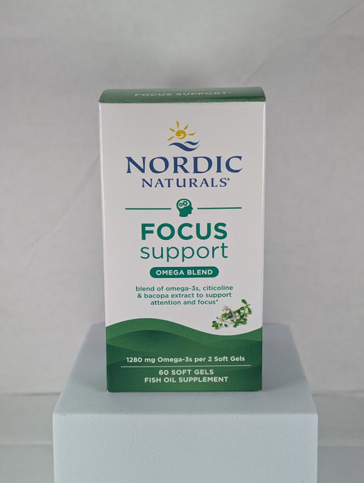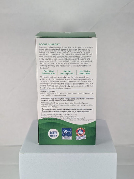 1280 mg Omega-3s Per 2 Soft GelsFish Oil SupplementCertified SustainableBetter AbsorptionNo Fishy Aftertaste3rd Party Purity TestedIgen Non-GMO TestedFriend Of The Sea Certified SustainableBlend of omega-3's, citicoline & bacopa extract to support attention and focus.Formerly called Omega Focus, Focus Support is a unique blend of nutrients that benefits attention and focus by supporting overall brain health. This powerful formula combines concentrated fish oil with a high DHA: EPA ratio with citicoline and Bacopa monnieri extract. Citicoline is a key source of the essential brain nutrient choline and supports mental focus-the brain's ability to stay on task. Bacopa monnieri is an Ayurvedic herb that supports working memory and helps decrease oxidative stress in the brain.At Nordic Naturals we make our fish oils using fresh, wild-caught fish to deliver re-esterified triglyceride-form omega-3s for better results. Certified sustainable and meeting or exceeding the strictest purity standards, our award-winning fish oils embody our commitment to the health of people and our oceans.The Nordic PromiseSuperior QualityFrom ingredient sourcing and product creation to shipping and customer care, superior quality is how we always deliver the best essential nutrients.Made with IntegrityOur products are grounded in science, formulated with care, and responsibly sourced for your family's health and peace of mind.Triglyceride form omega-3s are better absorbed than ethyl ester form omega-3s.
